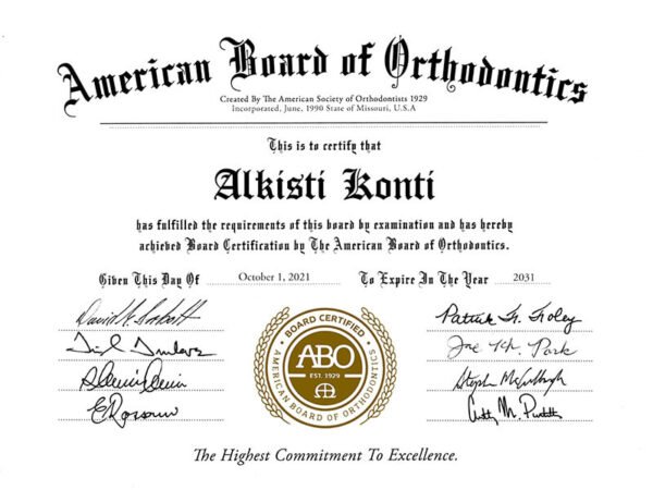 Η Άλκηστη Κόντη έχει ολοκληρώσει την εξειδίκευσή της στις Ηνωμένες Πολιτείες και διαθέτει έναν από τους πιο αξιόλογους τίτλους πιστοποίησης στον τομέα της ορθοδοντικής. Ας δούμε περισσότερα για αυτόν τον τίτλο, που απονέμεται από το American Board of Orthodontics (ABO), το μοναδικό ορθοδοντικό συμβούλιο ειδικότητας που έχει την επίσημη αναγνώριση της American Dental Association, σε συνεργασία με την American Association of Orthodontists.